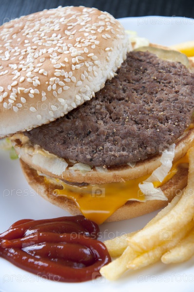 Аппетитный двойной гамбургер и жареный картофель на тарелке крупным планом