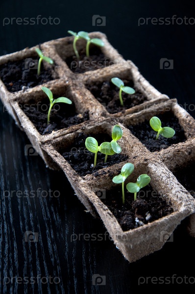 Зеленые саженцы в торфяных горшочках на черном фоне