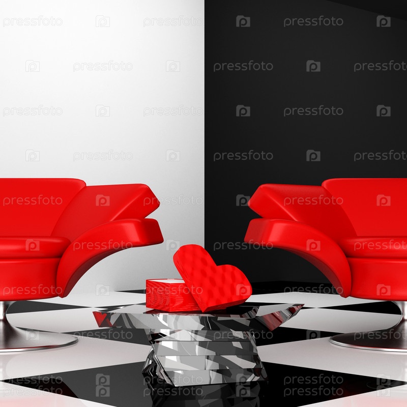 Черно-белый интерьер с двумя красными креслами с сердцем 3d