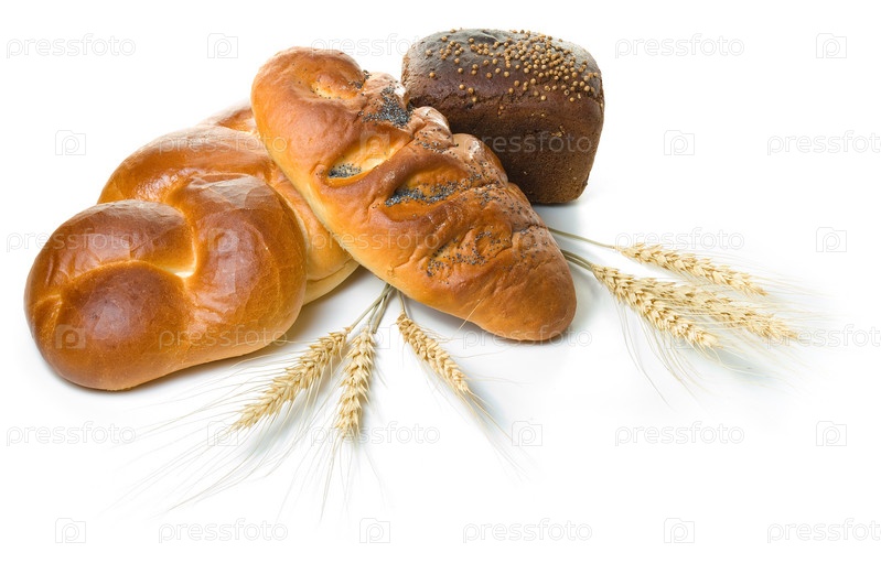 Хлебобулочные изделия и колосья пшеницы на белом фоне