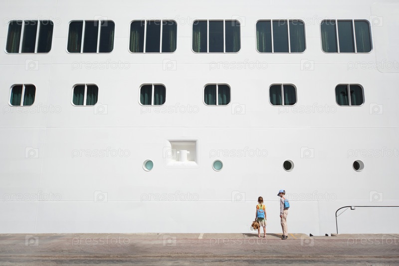 Мальчик и девочка рядом с большим пассажирским лайнером