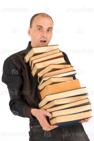 Молодой человек держит кучу книг