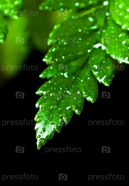Зеленый лист с каплями воды, изолированными на черном