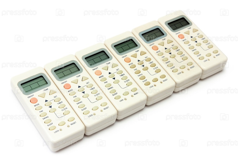 Ряд пультов дистанционного управления, изолированных на белом фоне