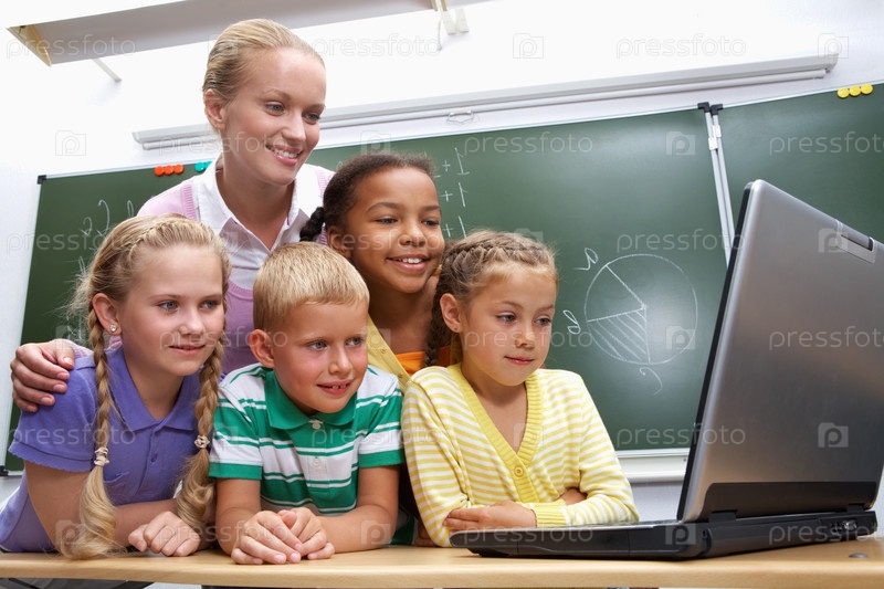 Учитель с учениками у ноутбука