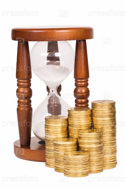 Песочные часы и монеты на белом фоне