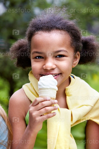 Темнокожая девочка ест мороженое, летний день
