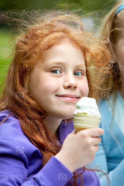 Очаровательная рыжеволосая девочка ест мороженое, летний день