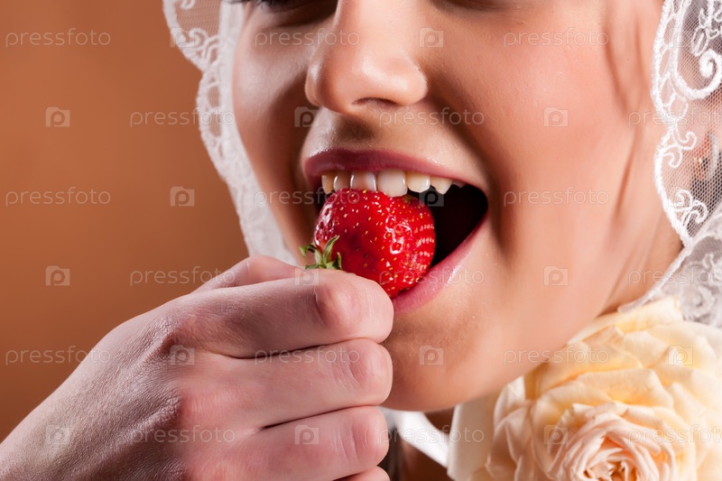 Молодая невеста ест клубнику