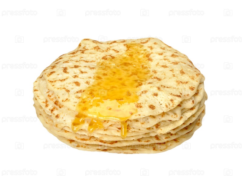 Блины с медом на белом фоне