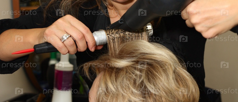 Женщина делает укладку волос феном
