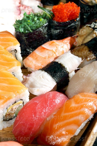 Тарелка с японскими роллами, красной икрой и морепродуктами