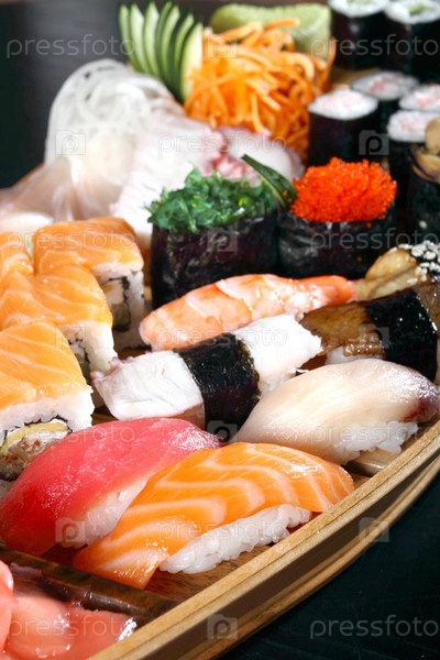 Тарелка с японскими роллами, красной икрой и морепродуктами