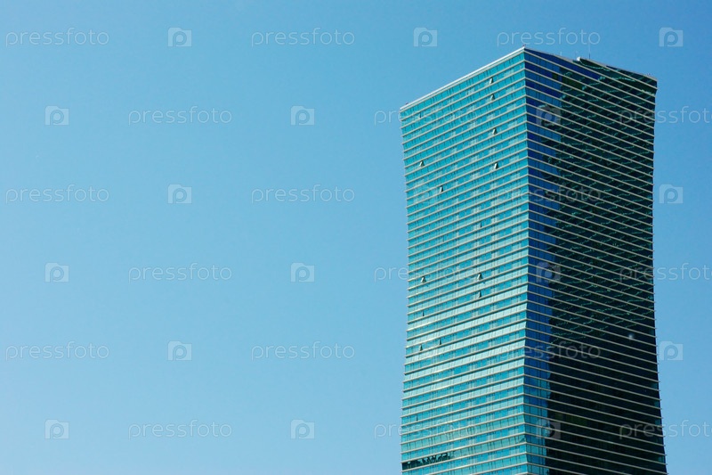 Высокое здание из синего и голубого стекла на фоне неба