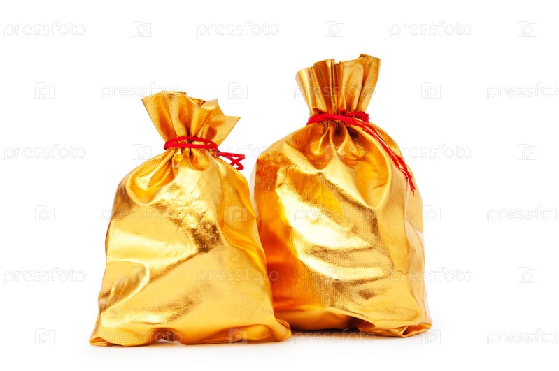 Золотистые мешки с подарками, изолированные на белом фоне