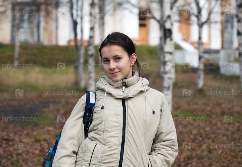 Школьница с рюкзаком в осеннем парке