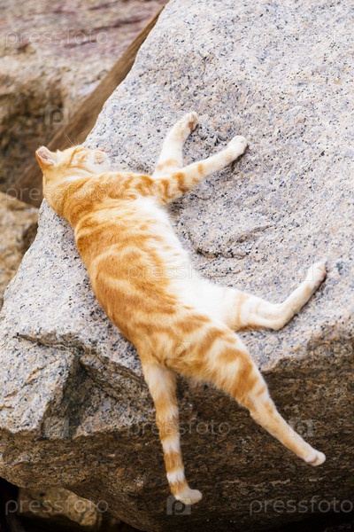 Кошка, спящая на камне