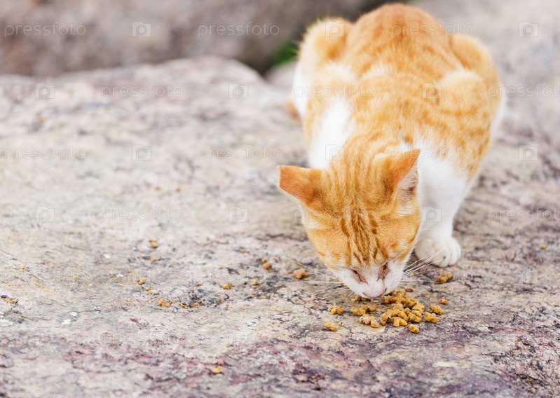 Уличная кошка ест