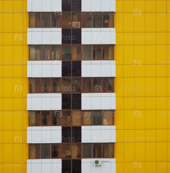 Фрагмент желтого здания с окнами и балконами