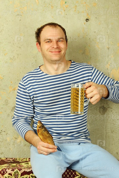 Молодой человек пьет пиво с вяленой рыбой, на фоне старой стены