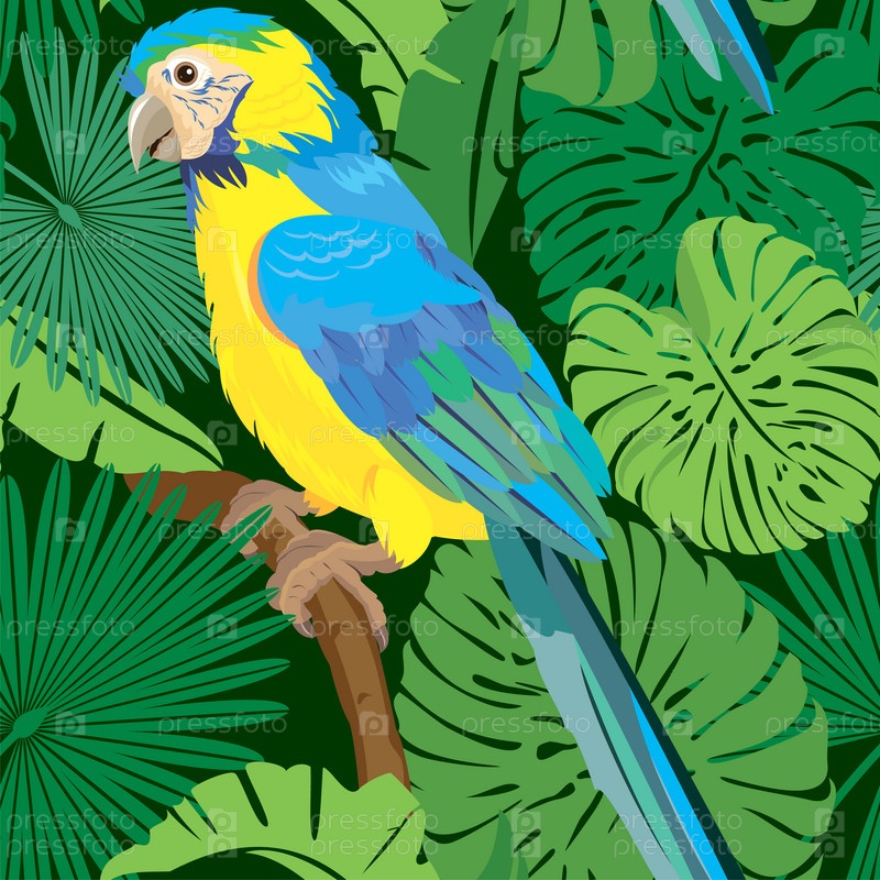 Бесшовный фон с листьями пальмы и попугаем