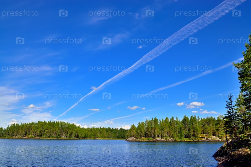 Карельский пейзаж и след самолета. Озеро Энгозеро, Северная Карелия, Россия