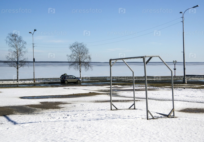Футбольные ворота на площадке перед озером