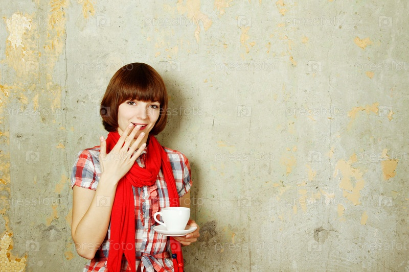 Девушка пьет кофе, стоя на фоне бетонной стены