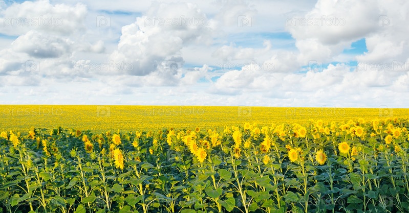 Поле цветущих подсолнухов и голубое небо