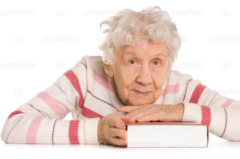 Портрет пожилой женщины с книгой на белом фоне