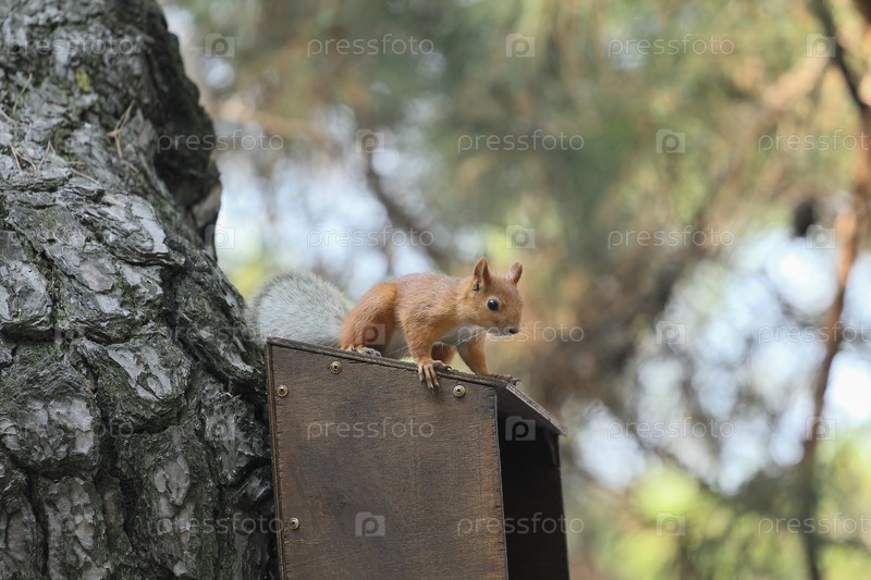 Белка сидит на кормушке