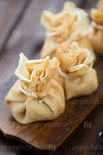 Блины с начинкой на деревянной разделочной доске
