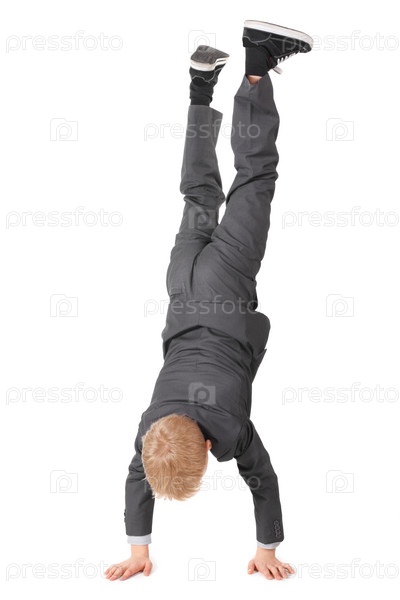 Мальчик в костюме стоит на руках на белом фоне