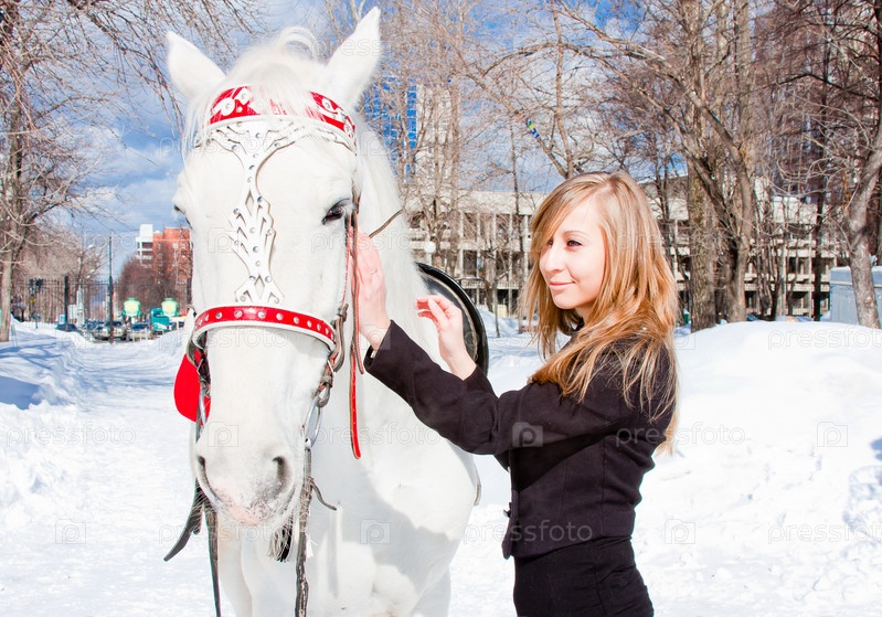 Симпатичная девушка с белой лошадью в зимнем парке