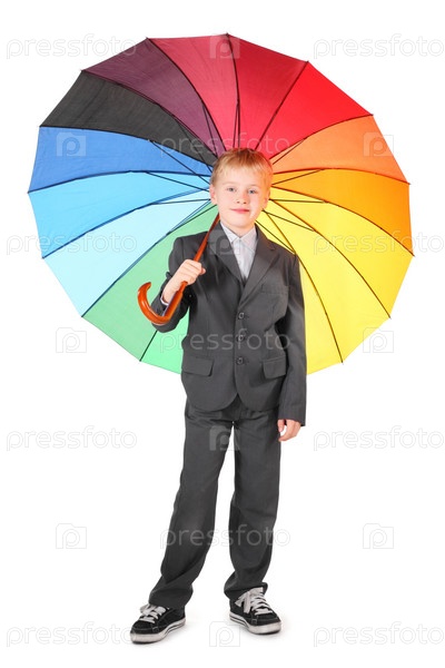 Мальчик в костюме с ярким зонтом на белом фоне
