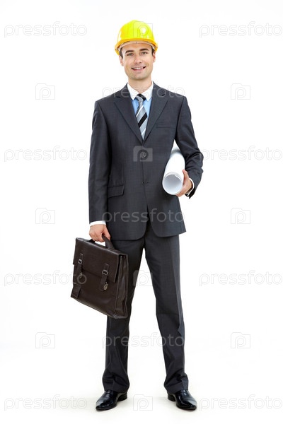 Мужчина в деловом костюме и строительной каске на белом фоне