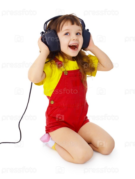 Маленькая девочка слушает музыку в наушниках
