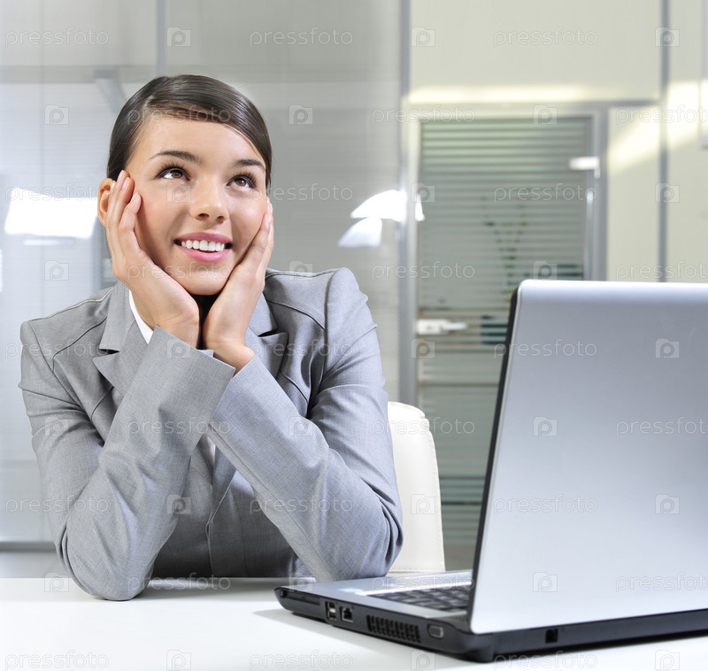 Мечтательная девушка, сидящая перед открытым ноутбуком