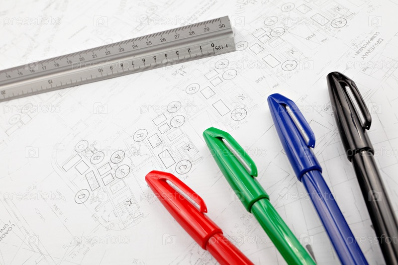 Чертежи, линейка и ручки