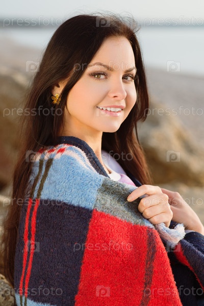 Брюнетка в пледе на открытом воздухе