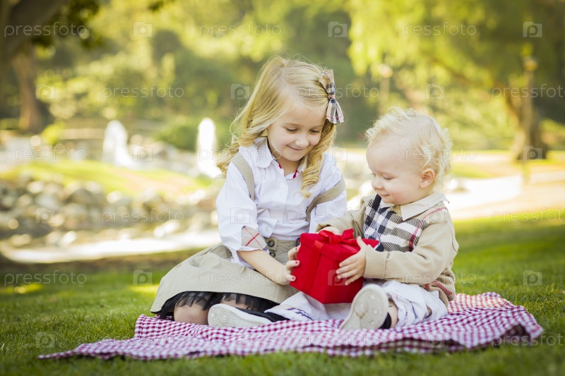 Девочка дарит подарок брату в парке