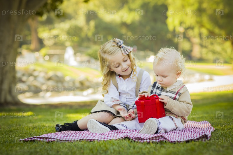 Девочка дарит подарок брату в парке