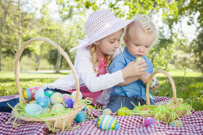 Брат и сестра с пасхальными яйцами