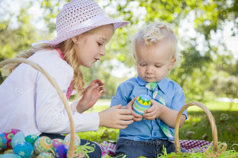 Брат и сестра с пасхальными яйцами