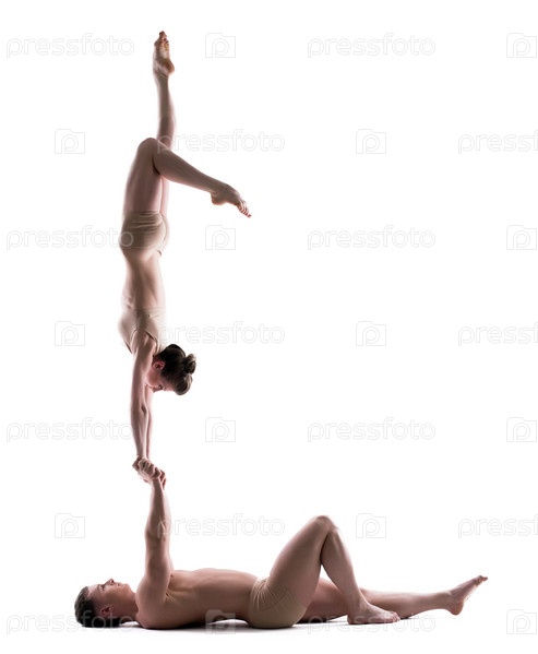 Молодые грациозные гимнасты позируют в студии на белом фоне