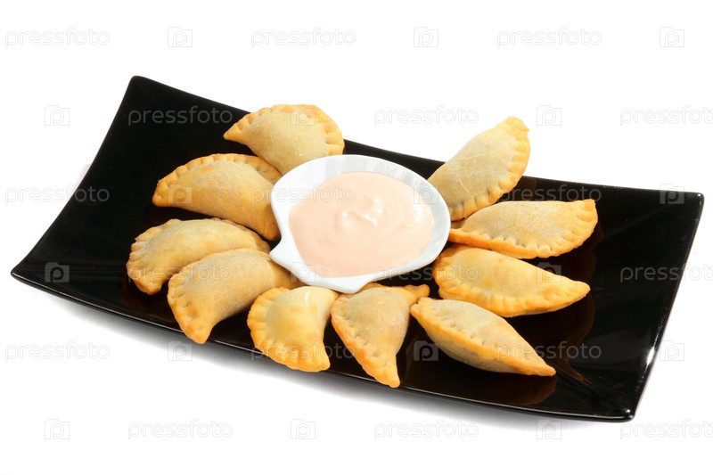 Пирожки с соусом на черной плоской тарелке
