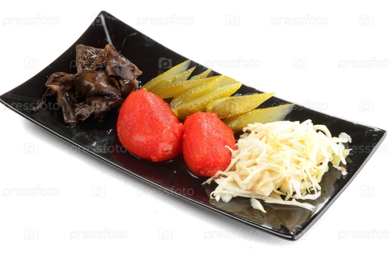 Маринованные овощи на черной прямоугольной тарелке