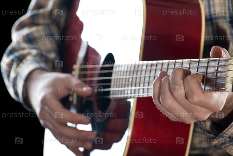 Мужчина играет на шестиструнной гитаре. Изолирован на черном фоне