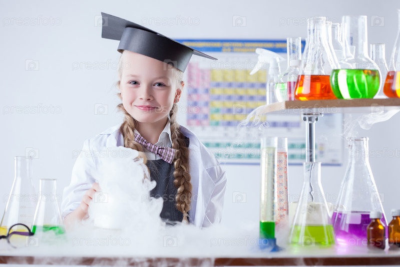 Маленькая девочка смешивает реагенты в лаборатории