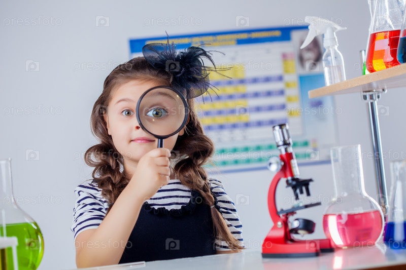 Симпатичная девочка смотрит через лупу